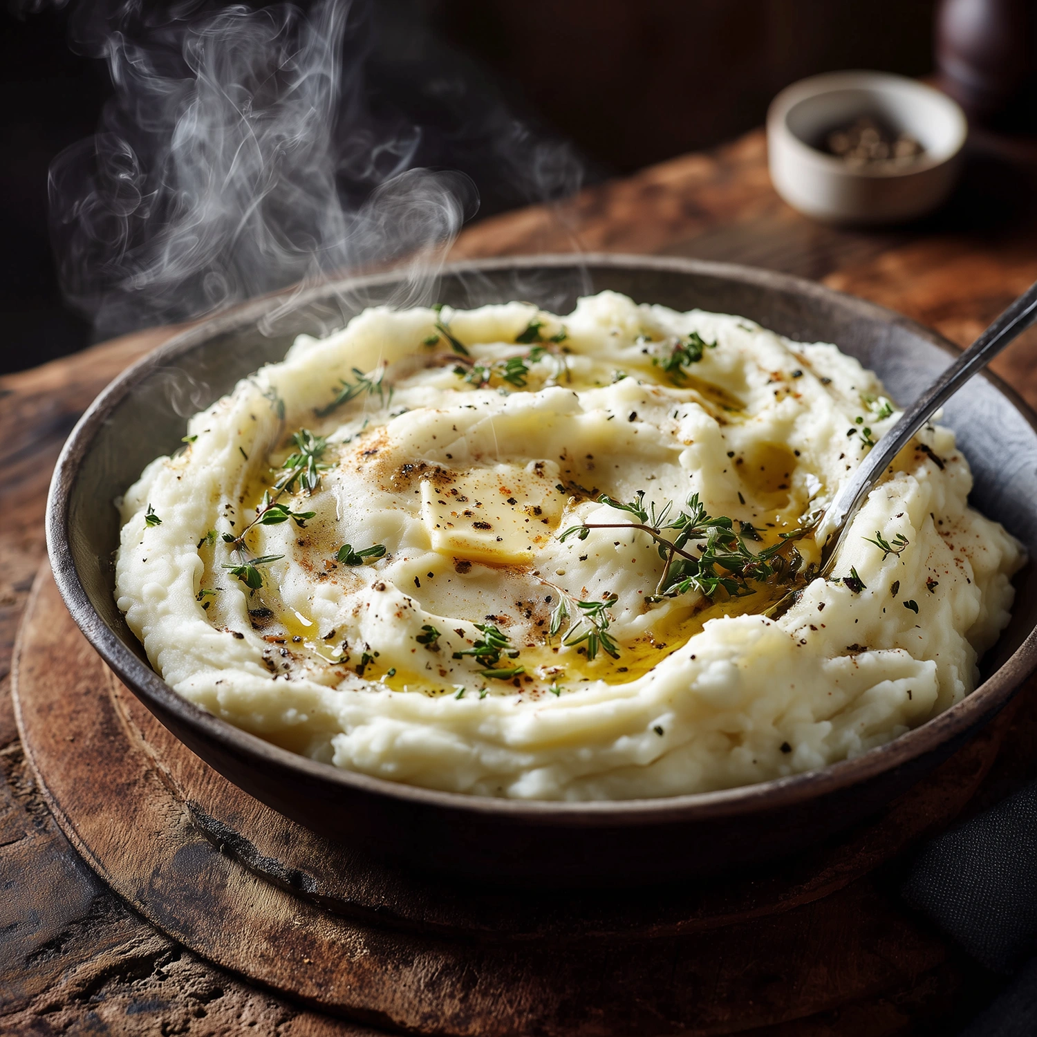 Purée de pommes de terre onctueuse et généreuse, préparée avec beurre et lait entier pour une texture fondante et un goût authentique.