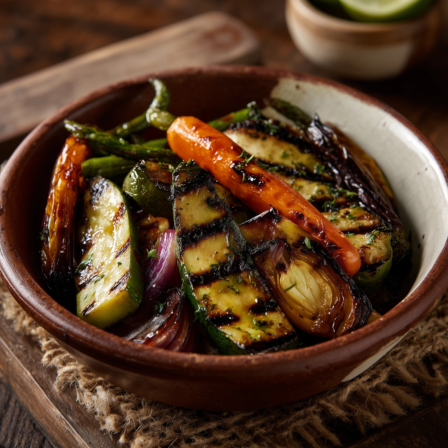 Assortiment coloré de légumes frais — courgettes, poivrons, carottes, asperges — grillés à l’huile d’olive pour une saveur ensoleillée.