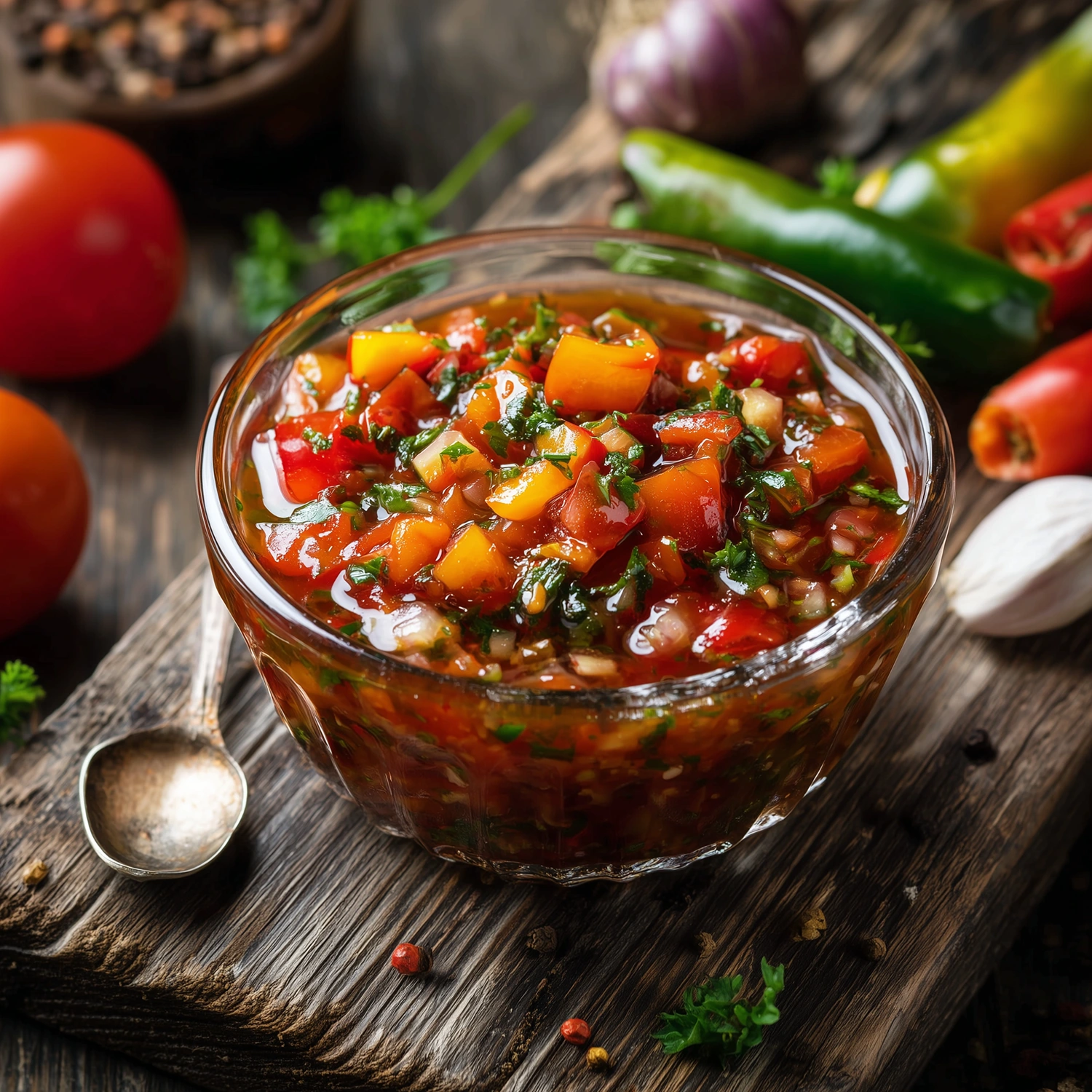 Salsa maison aux poivrons, tomates et oignons, relevée d’une pointe d’huile d’olive. Parfaite pour accompagner les viandes grillées.