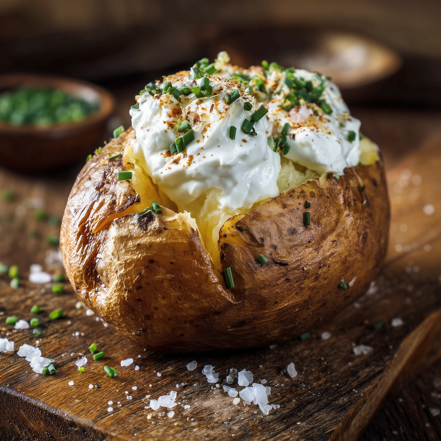 Pomme de terre entière cuite au four, garnie de crème fraîche et ciboulette. Simple, fondante et savoureuse.