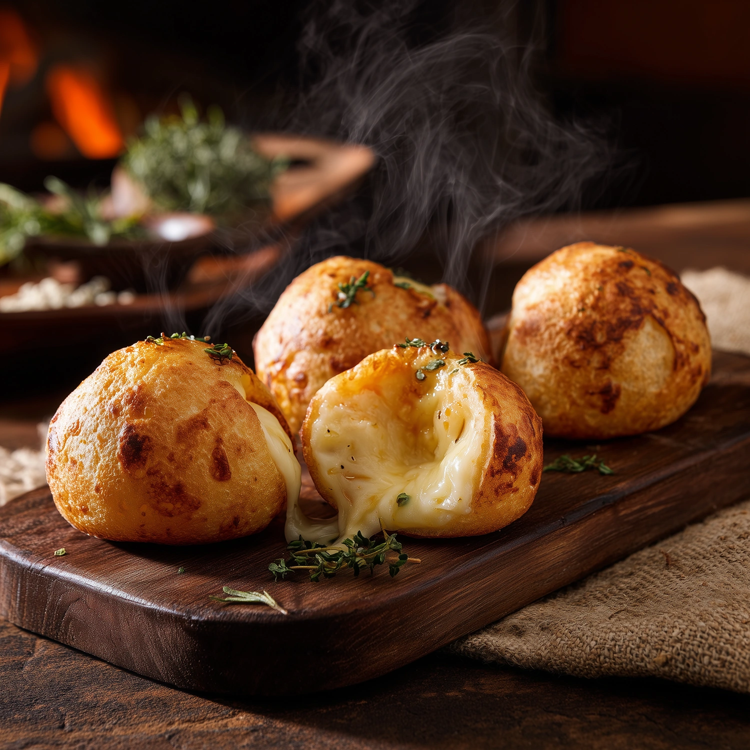 Petits pains brésiliens au fromage, moelleux à l’intérieur et légèrement croustillants à l’extérieur. Servis chauds pour révéler toute leur saveur.