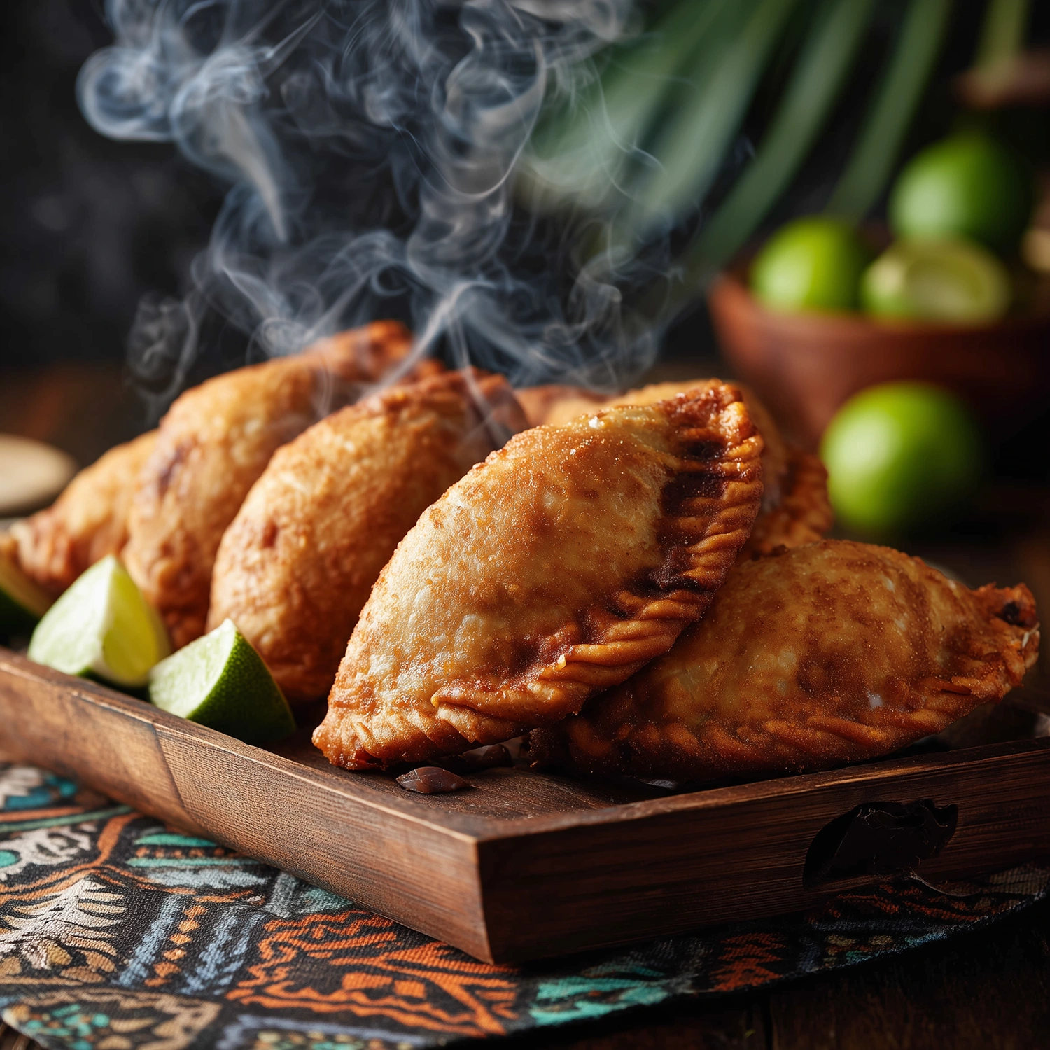 Chaussons frits dorés à souhait, garnis de viande ou de fromage, servis chauds façon street food brésilienne.